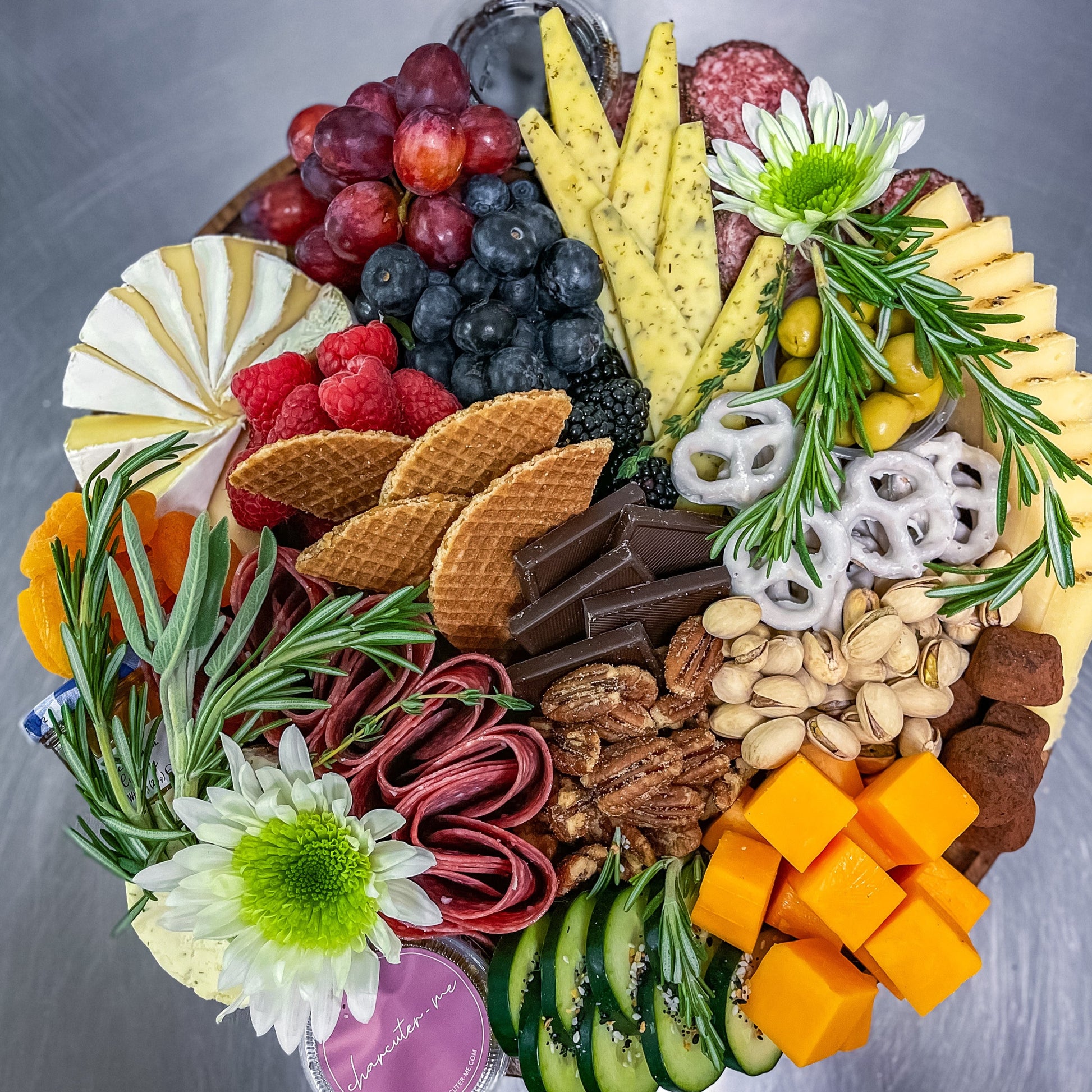 Our boards come with a selection of charcuterie meats, cheeses, and an assortment of fruits, nuts, veggies, and other accoutrements.